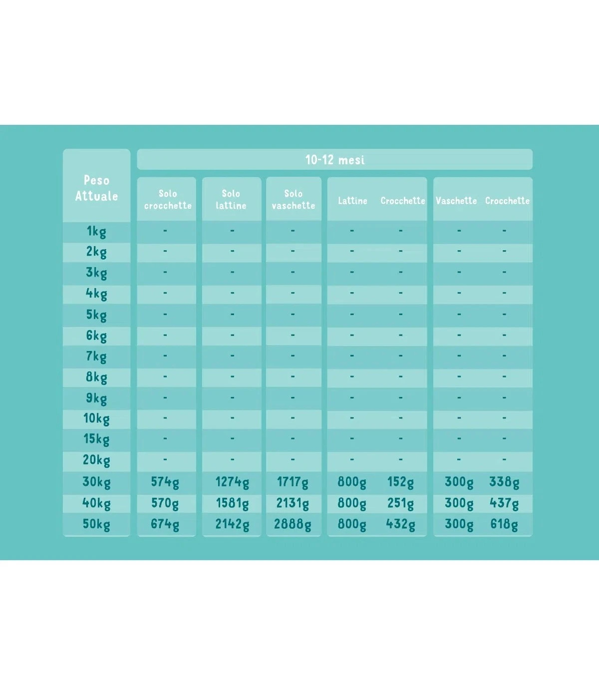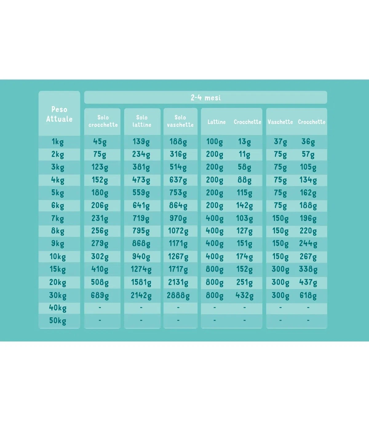 Vedi tabelle nelle immagini. Troverai indicazioni di dosaggio per cuccioli da 0 a 12 mesi d’età.