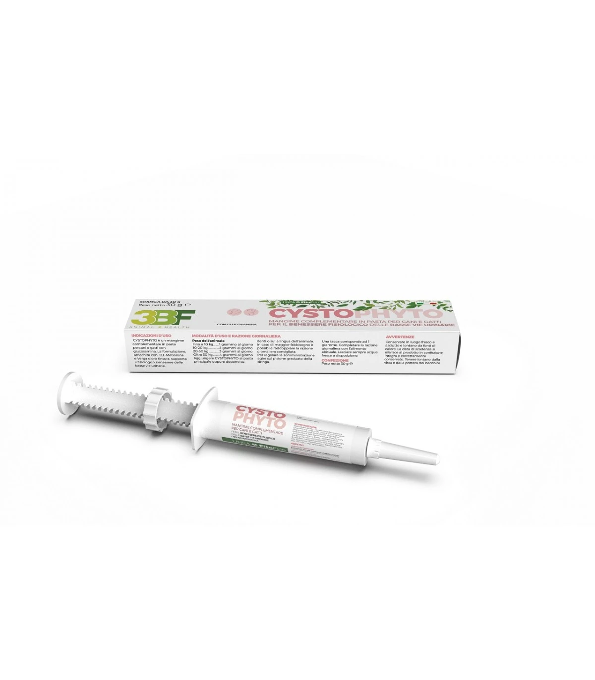 Aggiungere CYSTOPHYTO  al pasto principale oppure deporre su denti o sulla lingua dellâanimale. Utilizzare per 1-2 settimane. Su consiglio medico veterinario, per i primi 7 giorni, è possibile raddoppiare la razione giornaliera consigliata, suddividendo le somministrazioni con un intervallo di  12 ore, per poi proseguire con la normale razione giornaliera nei giorni successivi. Per regolare il dosaggio agire sul pistone graduato della siringa. Una tacca corrisponde ad 1 grammo. Completare la razione giornaliera con lâalimento abituale. Lasciare sempre acqua fresca a disposizione. Consultare un medico veterinario prima dellâimpiego.